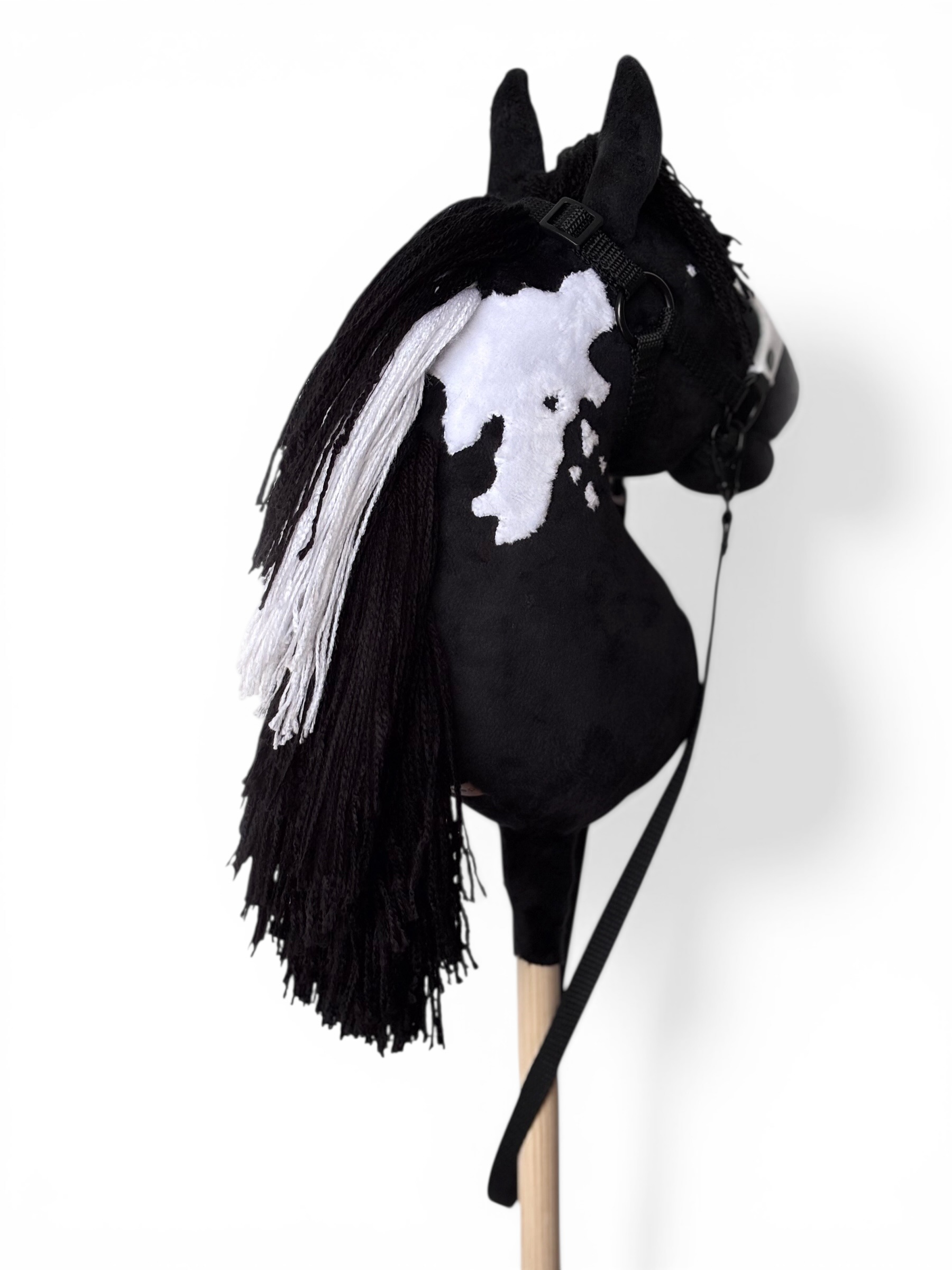 Konik Hobby Horse A5 umaszczeniu karym. Grzywa dwukolorowa czarno- biała i na głowie liczne plamki oraz latarnia . Starannie wykonany, miękki i lekki, idealny do zabawy, treningów hobby horse oraz skoków przez przeszkody. W zestawie znajduje się kantar oraz lejce, które umożliwiają prowadzenie konika jak prawdziwego konia.