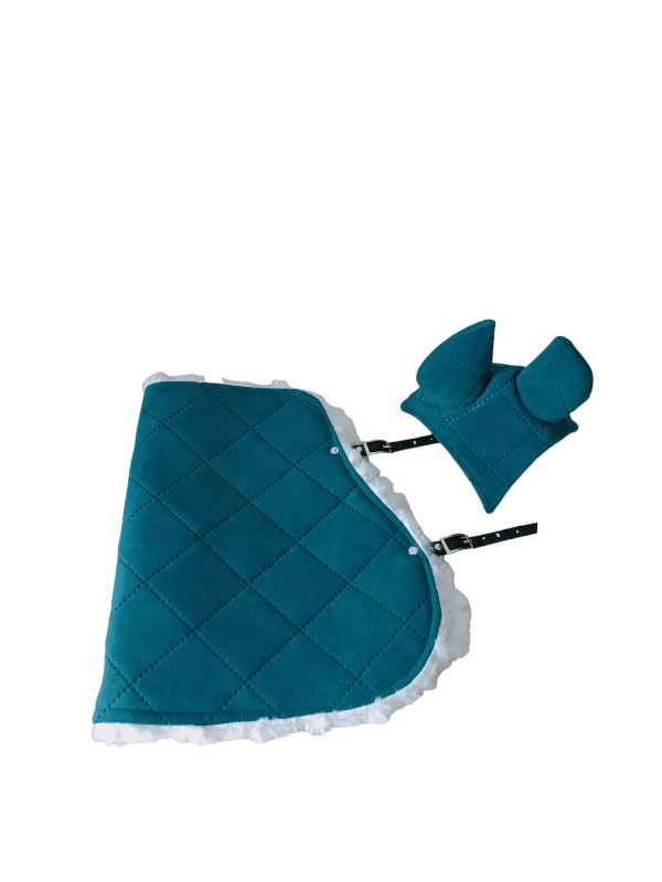 Zestaw to: Czapeczka dopasowana kolorystycznie do derki . Derka dwustronna wykonana z dwóch rodzajów tkanin. Z jednej strony pikowana tkanina z drugiej strony inna tkanina dopasowana kolorystycznie . Wygodne zapięcie metalowe -tworzy nowy look dla konika 😉